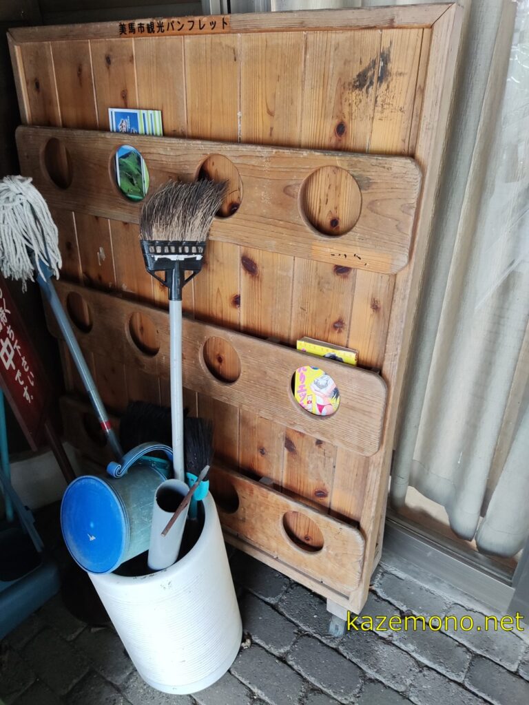 直売所いなか市の入口前にはモップやホウキなどの掃除道具と、パンフレットを置くボードがあった。