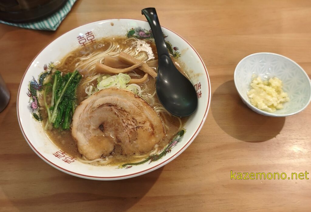 麺に絡むスープの濃さ、追加にんにくの新鮮さ、卓上の魚粉でさらに濃さを足せる感じ。